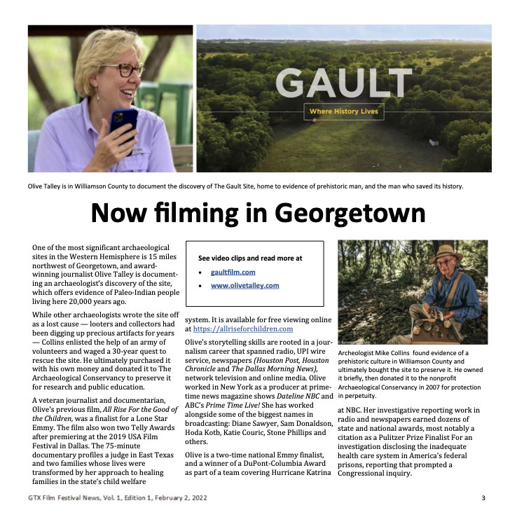 Thank you to the Georgetown (GTX) Film Festival and Board President Cindy Weigand for highlighting the Gault Documentary in newsletters and Festival News, an insert published in The Williamson County Sun newspaper. We appreciate the local support from Gault’s nearby neighbors in Georgetown, TX.
